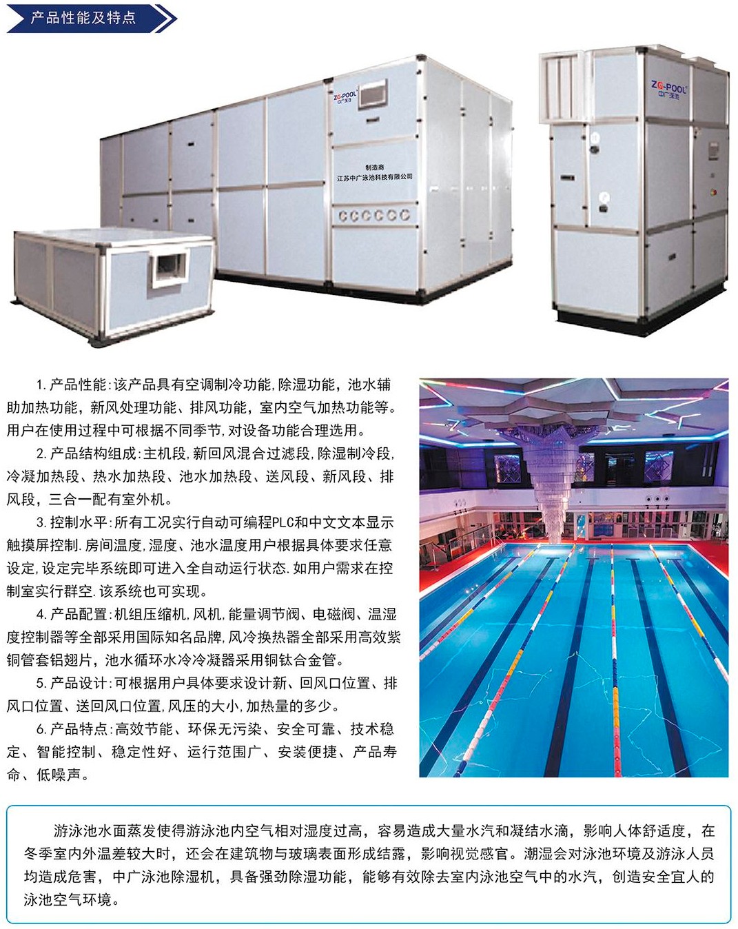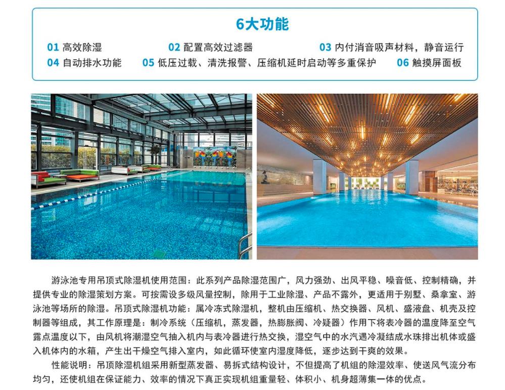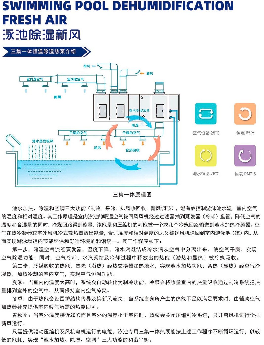 三集一體除濕熱泵,是指具有:泳池水熱水、泳池室空氣除濕、室內(nèi)空調(diào)三樣功能集一體的熱泵,該熱泵一般還具有,新風(fēng)排風(fēng)功能,熱回收功能,因此也有人叫它五集一體。